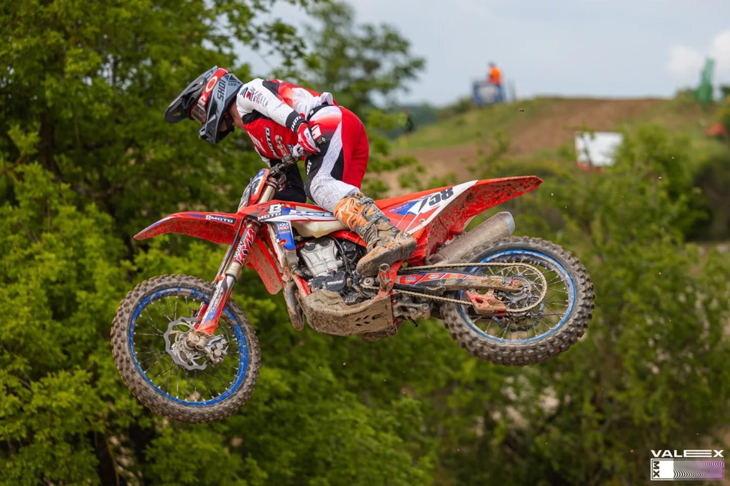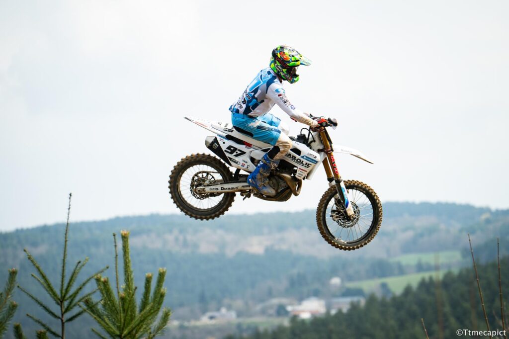 Raffael Blond, Mathieu Santoni et Noa Quinzeling trusteront le haut du tableau lors de la séance chronométrée, alors que le départ de la première manche sera marqué par un accrochage collectif qui verra Jeremy Coen – 3ᵉ à Yssingeaux – se fracturer le tibia et le péroné, une blessure qui met déjà un terme à ses espoirs pour la saison 2026. Alex Diètre mènera le premier tour avant d’être repris par Raffael Blond puis Mathieu Santoni, monté en MX1 cette année chez Nitrx Racing. Raffael s’imposera dans cette manche, mais Mathieu Santoni sera repris par Julien Pelletier en fin de course pour terminer troisième devant Alex Diètre et Alexis Paris (5ᵉ), défait par Dorian Juin (6ᵉ) et Ryan Bonnewijn (7ᵉ) dans la seconde moitié de la manche.