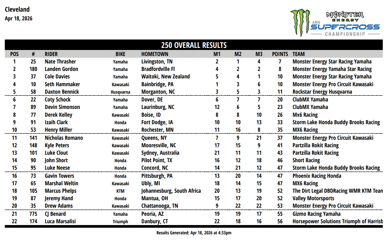 Nate Thrasher signe le holeshot de la première finale 250 à Cleveland devant Cole Davies et Seth Hammaker. Ce dernier déborde un temps le leader du championnat avant d’être repris. Davies hausse alors le ton pour aller chercher son coéquipier en tête, mais chute en sortie de virage et repart hors du top 5. Hammaker en profite pour s’installer en deuxième position et, bien décidé à capitaliser, accélère pour revenir sur Thrasher et s’imposer. Daxton Bennick complète le podium devant Landen Gordon (4e) et Davies (5e), défait de Coty Schock (6e) dans les derniers instants.