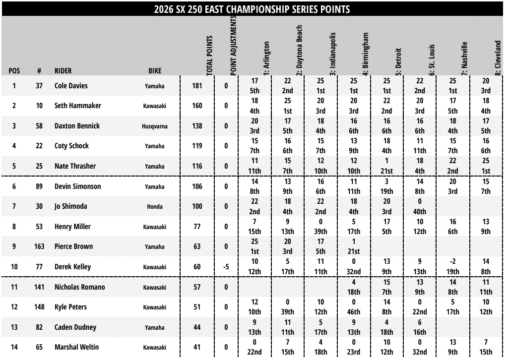 Au championnat, Cole Davies quitte Cleveland avec 21 points d’avance sur Seth Hammaker. Il pourrait même être sacré dès la prochaine épreuve s’il parvient à reprendre encore 4 points à son rival du team Pro Circuit. Daxton Bennick (-43) occupe la troisième place, devant Coty Schock (-62) et Nate Thrasher (-65).