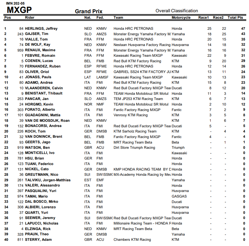 Tim Gajser tiendra bon jusqu’au bout, donnant la réplique à Jeffrey Herlings – second. Lucas Coenen termine troisième devant Kay de Wolf et Maxime Renaux (5e). Après sa chute, Tom Vialle revient en sixième place.