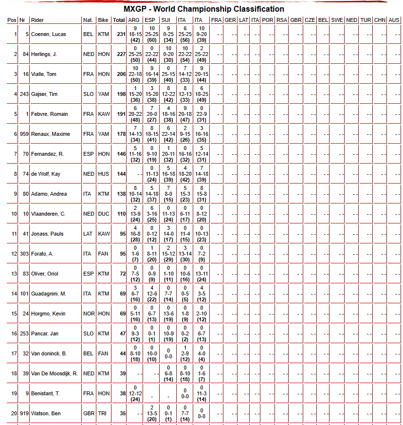 Avant le Grand Prix de France, Lucas Coenen voit son avance au championnat réduite à 4 points. Tom Vialle (-25), Tim Gajser (-33) et Romain Febvre (-40) sont présents dans le top 5.