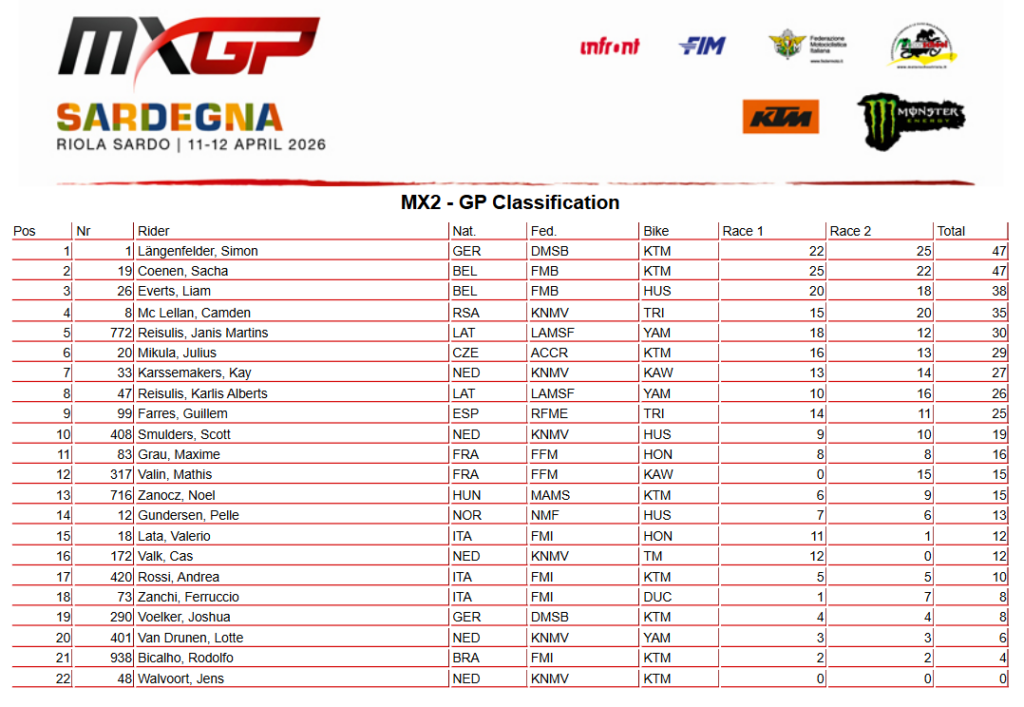 Quatre Grands Prix disputés, et déjà trois victoires pour Simon Längenfelder, qui confirme qu’il sera bien l’homme à battre cette saison alors qu’il défend son titre de champion du monde MX2. Battu par Sacha Coenen le samedi ainsi qu’en première manche le dimanche, le pilote allemand n’aura eu qu’à attendre l’erreur de l’officiel De Carli KTM dans le second débat pour se retrouver seul en tête et faire résonner l’hymne national allemand à Riola Sardo.