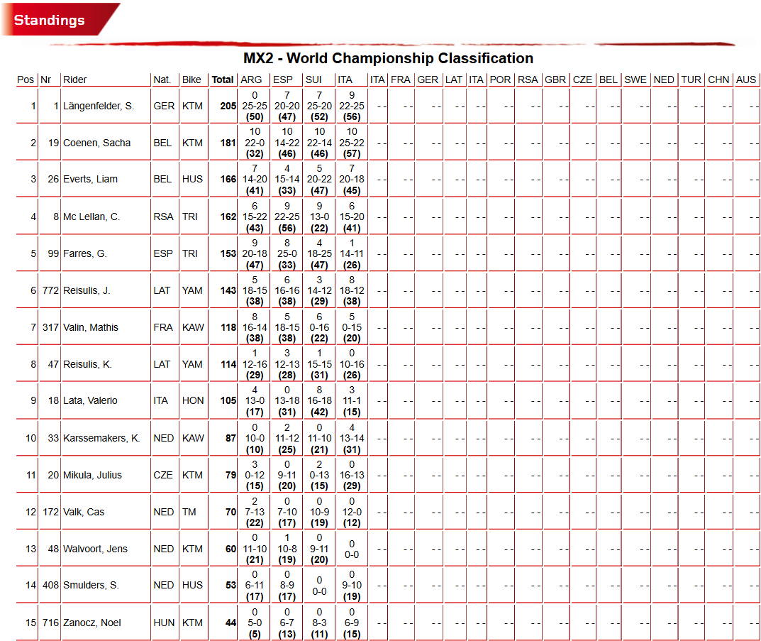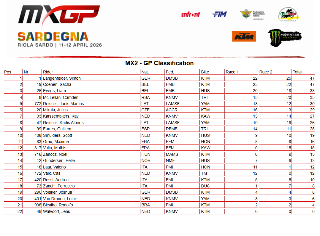 Quatre Grands Prix disputés, et déjà trois victoires pour Simon Längenfelder, qui confirme qu’il sera bien l’homme à battre cette saison alors qu’il défend son titre de champion du monde MX2. Battu par Sacha Coenen le samedi ainsi qu’en première manche le dimanche, le pilote allemand n’aura eu qu’à attendre l’erreur de l’officiel De Carli KTM dans le second débat pour se retrouver seul en tête et faire résonner l’hymne national allemand à Riola Sardo.