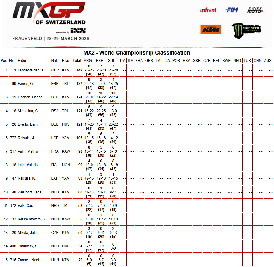 Seul pilote a être monté sur les trois podiums en ce début de saison, Simon Langenfelder retrouve la plaque rouge de leader du mondial MX2 et compte 22 points d’avance sur l’Espagnol Guillem Farres. Suit ensuite Sacha Coenen (-25) et Camden McLellan (-28), rétrogradé de la première à la quatrième place en l’espace de deux manches. Le pilote sud-africain est désormais ex-aequo avec Liam Everts (-28), cinquième. Mathis Valin repart de Suisse avec la septième place provisoire du championnat, pour 51 points de retard sur Simon Langenfelder.
