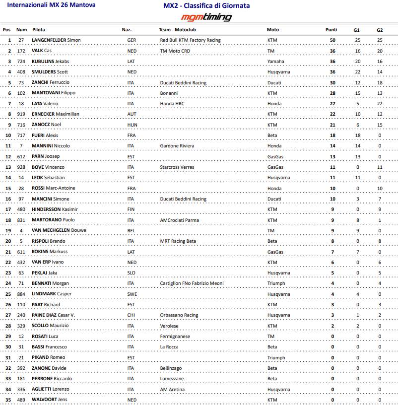 Une chute de Jekabs Kubulins le verra perdre quelques positions, alors que Simon Langenfelder débordera ses concurrents un à un puis ira chercher Valerio Lata – qui comptait 10 secondes d’avance – pour aller s’imposer devant l’Italien et sa Honda officielle. Cas Valk placera sa TM en troisième place en profitant de l’abandon de Jens Walvoort sur casse mécanique.