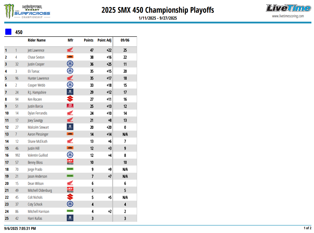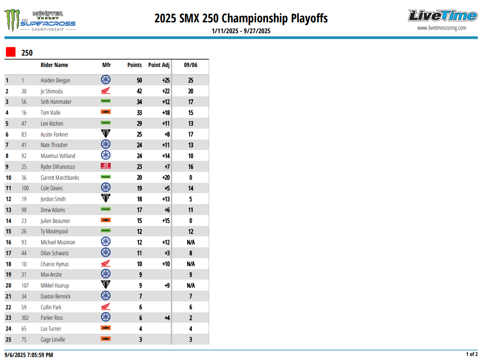 Au championnat – gardons en tête que des points sont attribués en fonction du classement SMX avant les playoff – Haiden Deegan mène la catégorie 250 pour 8 points d’avance sur Jo Shimoda, et 16 points d’avance sur Seth Hammaker. Tom Vialle pointe quatrième à 17 unités d’Haiden, avec 4 points d’avance sur Levi Kitchen – cinquième.