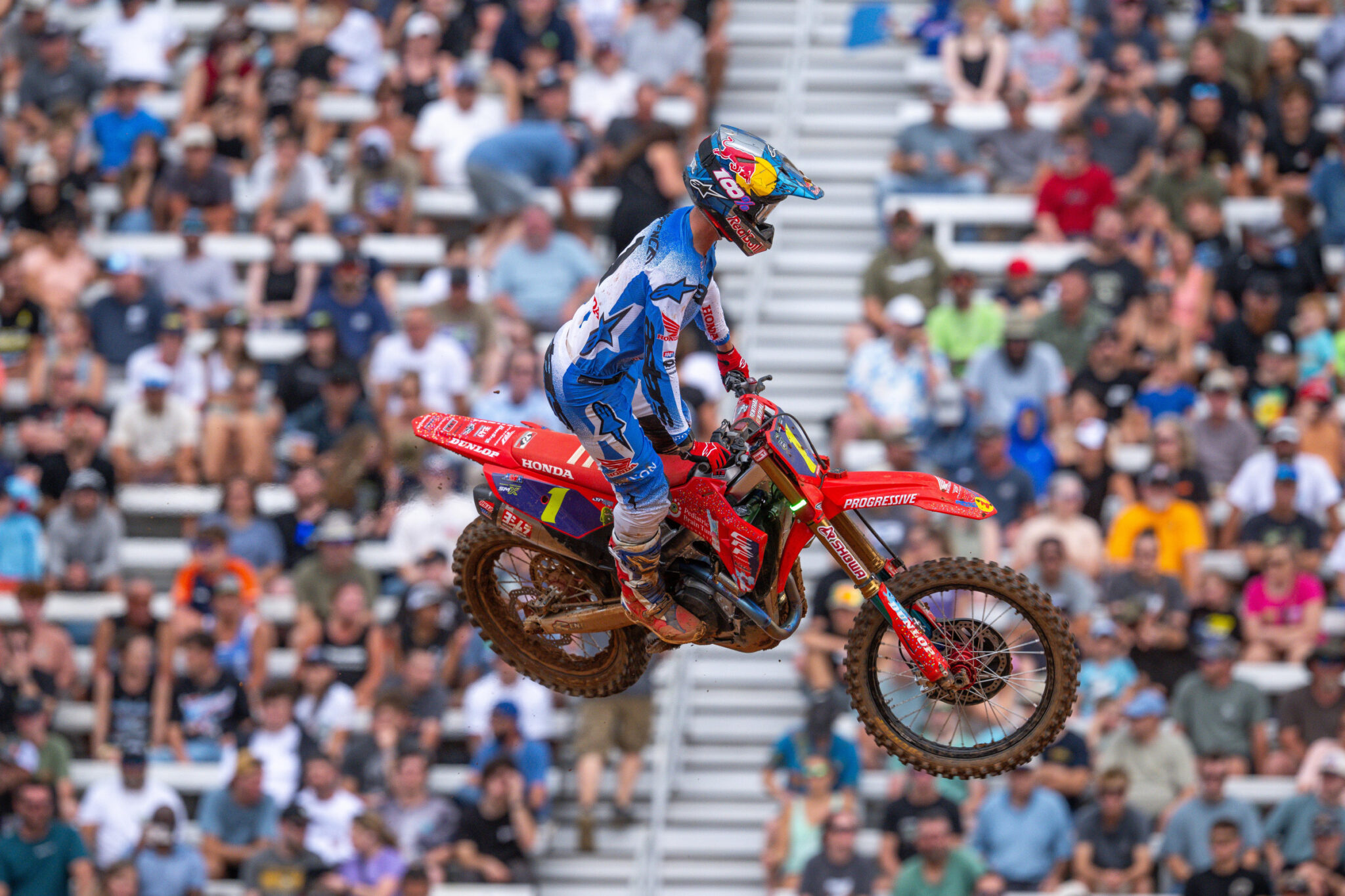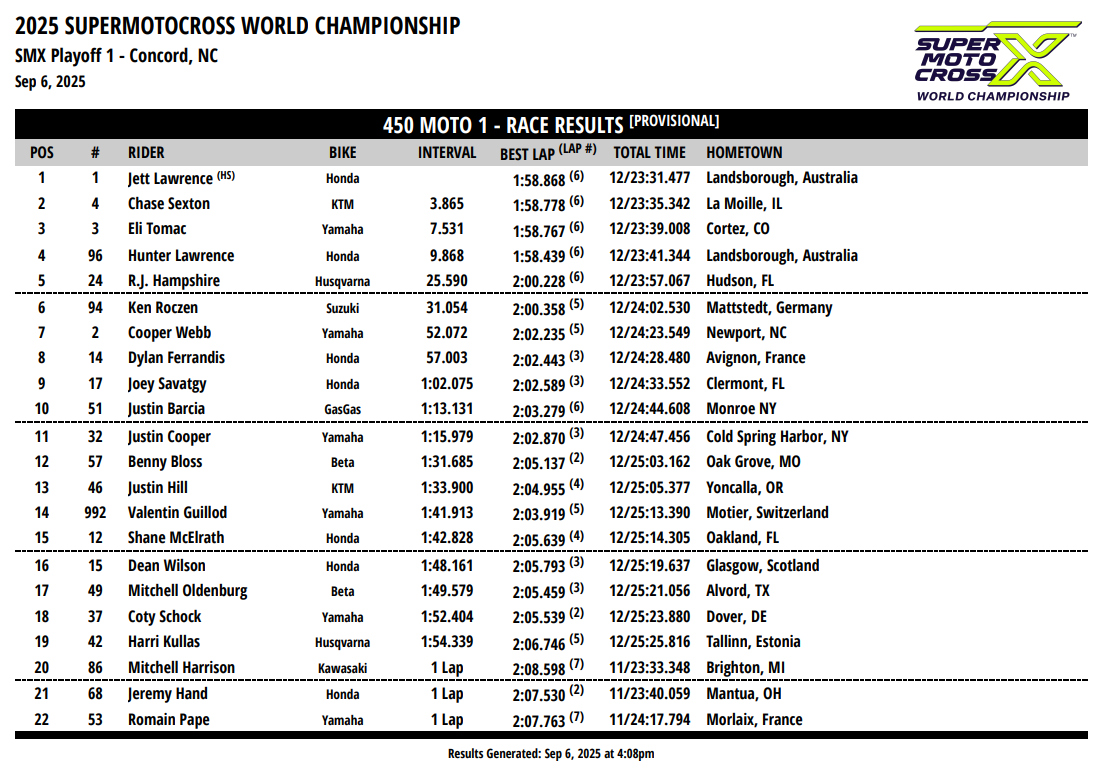 Sur le tracé technique de Charlotte, Jett Lawrence aura bien du mal à se défaire d’Eli Tomac, resté dans son aspiration pendant un bon moment jusqu’à une erreur de l’officiel Yamaha en sortie de virage dans le 9e tour. En sortant de l’ornière, Eli tombera; une aubaine pour Chase Sexton, qui en profitera pour s’installer en deuxième position avant que la météo ne se dégrade dans les derniers tours. Le top 3 restera ensuite inchangé : Jett Lawrence s’imposera devant Chase Sexton et Eli Tomac. Quatrième, on retrouvera Hunter Lawrence, juste devant RJ Hampshire, qui parviendra à dépasser Ken Roczen (6e) en toute fin de course, confirmant une nouvelle fois sa place parmi les meilleurs pilotes de la catégorie reine.