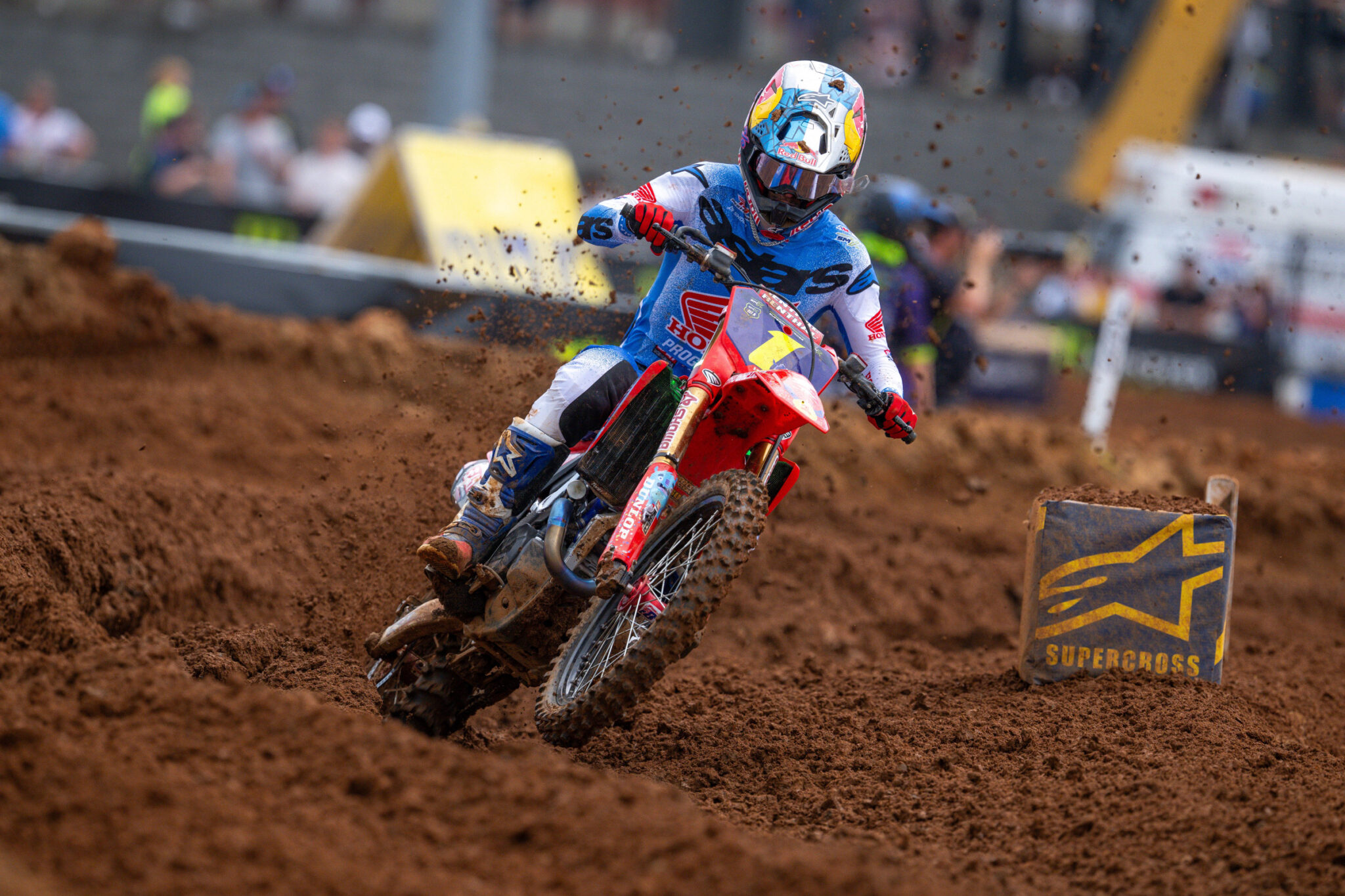 En catégorie reine, on assistera à une nouvelle victoire de Jett Lawrence cette saison. L’officiel Honda HRC réalisera le meilleur départ devant Eli Tomac, Ken Roczen et Chase Sexton, tandis que Justin Cooper – arrivé avec la plaque rouge de leader du SMX – se retrouvera bon dernier après avoir chuté dès le premier tour.