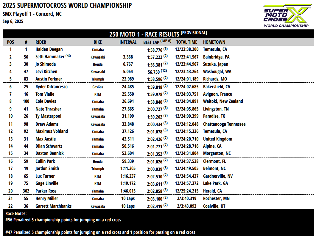 Pointé 7e au départ, Haiden profitera des chutes de Shimoda et Davies pour gagner deux positions. Il débordera également Drew Adams, Tom Vialle et Austin Forkner pour s’installer second, mais Seth Hammaker était déjà loin, alors que Levi Kitchen se faisait présent dans la roue arrière du pilote Star Racing Yamaha. Mais Haiden se défera de la pression du pilote Pro Circuit Kawasaki, tombera les chronos et se retrouvera dans la roue arrière de Seth Hammaker à deux tours de l’arrivée. Le pilote Kawasaki ne sera pas en mesure de résister bien longtemps et se fera reprendre le leadership en toute fin de manche. Haiden l’emportera devant Haiden Deegan et Levi Kitchen, alors que Jo Shimoda reviendra en quatrième place après sa chute du début de course. Austin Forkner accrochera la cinquième place devant Ryder DiFrancesco (6e) et Tom Vialle (7e), qui n’était pas spécialement dans son élément à Charlotte.