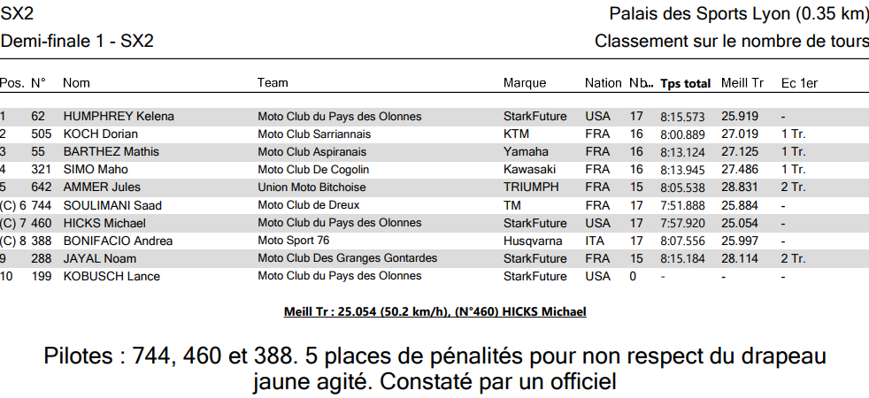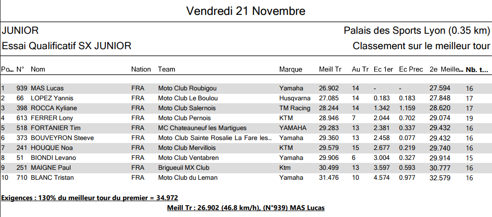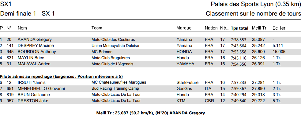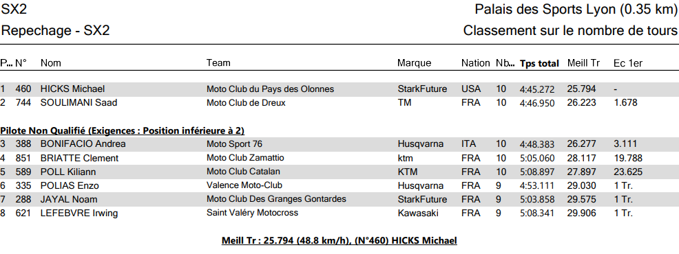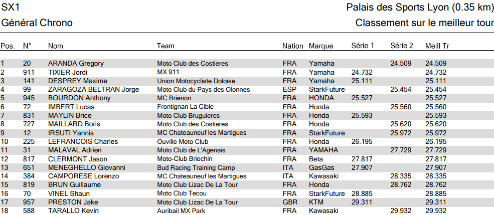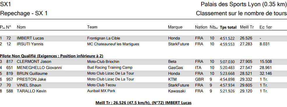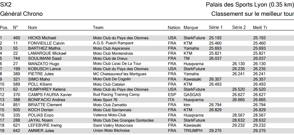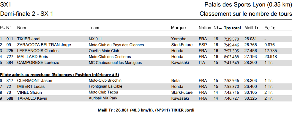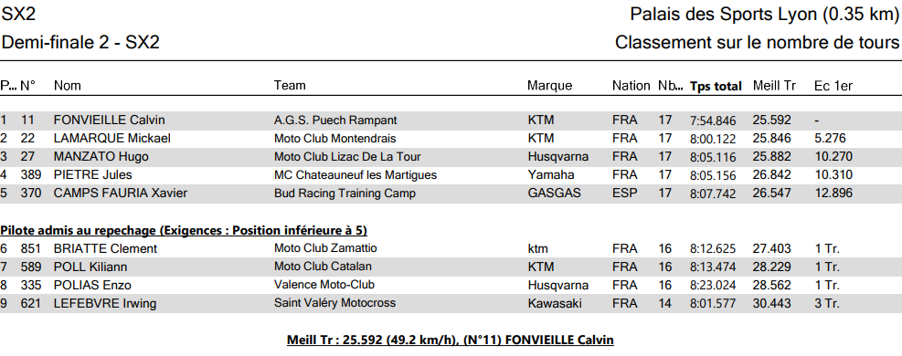 Avant-dernière ligne droite pour les pilotes du SX Tour avec la première soirée du Supercross de Lyon. Ce week-end, les pilotes SX2 & SX1 se disputeront le titre de champion de France – Yannis Lopez ayant déjà titre en poche chez les Juniors. Avantage à Calvin Fonvieille et Maxime Desprey dans leur catégorie respective, pour l’heure. Retrouvez tous les résultats de cette première journée / soirée de course ci-dessous.