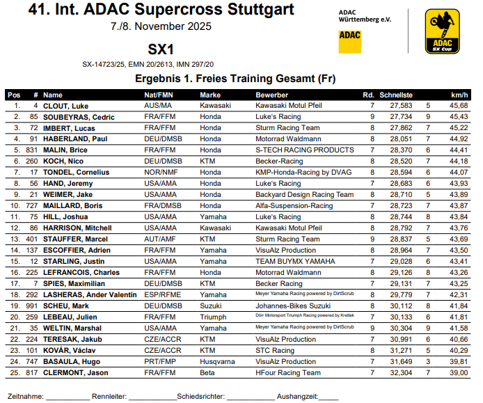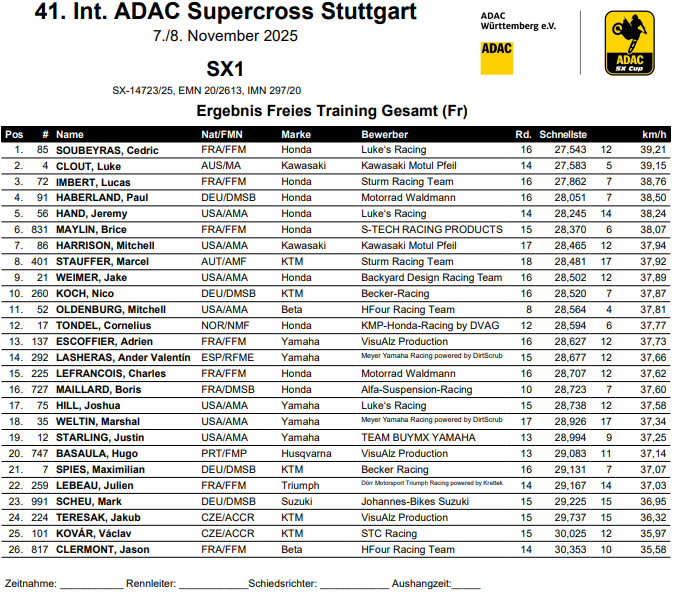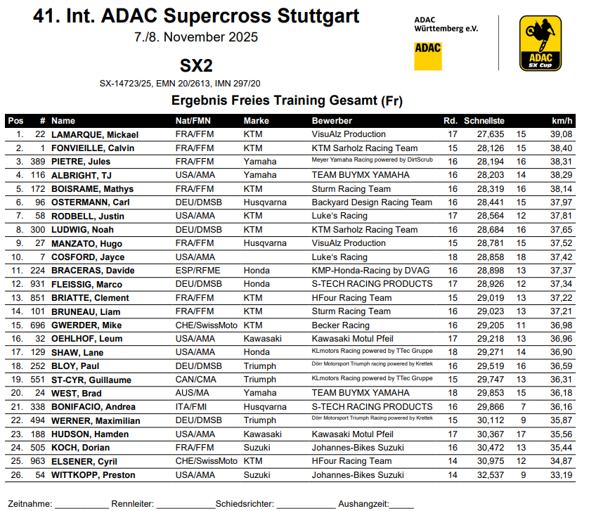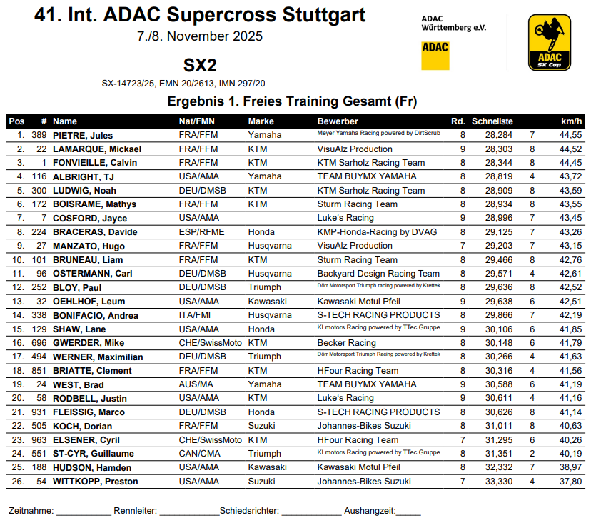 Place au 41ème Supercross de Stuttgart ce week-end, en présence de nombreux Français qui feront face à une belle délégation Américaine mais pas que. Disputé sur deux soirées, le Supercross de Stuttgart marque l’ouverture du SX Allemand. Retrouvez tous les résultats de la première journée du vendredi ci-dessous.