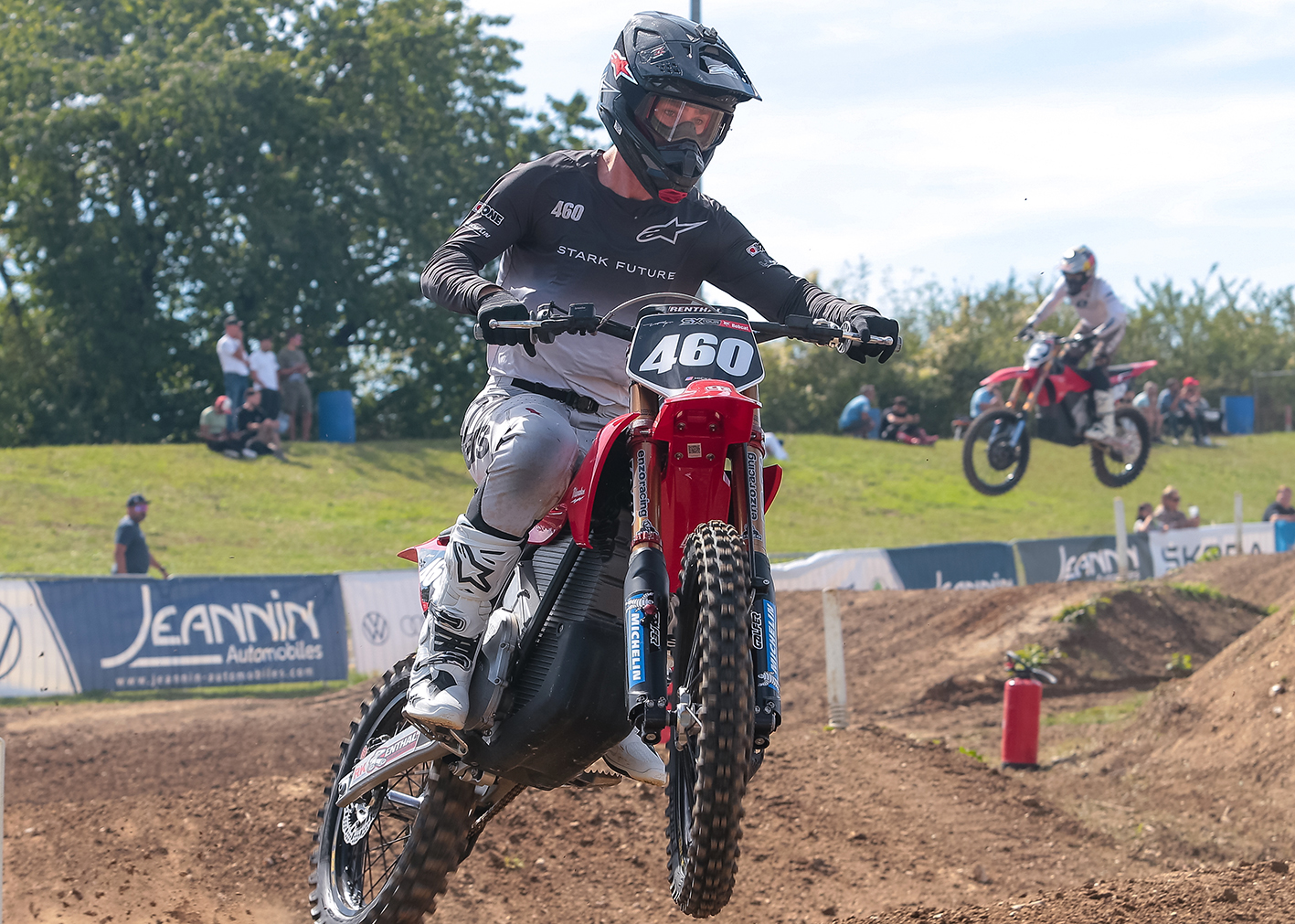 La folie s’est emparée de la catégorie SX2 tellement la finale de Brienon a été riche en bouleversements. Ce sont les Stark Future qui prenaient les commandes au premier virage, emmenées par Michaël Hicks et son coéquipier Lance Kobush. Jules Pietre était alors troisième suivi d’une autre Stark: celle de Kelena Humphrey, lui-même pourchassé par Mickaël Lamarque. Le rythme était endiablé entre ces cinq pilotes avant que Mickaël Lamarque ne quitte prématurément la course. Quid des trois leaders du championnat ? Manquaient à l’appel Tom Guyon seulement 8ème au premier passage – mais aussi Calvin Fonvieille -9e – et le leader du championnat Mathys Boisramé qui pointait hors du top 10. Scénario improbable et inédit. Les quatre leaders Michaël Hicks, Lance Kobush, Jules Pietre et Kelena Humphrey se marquaient, s’attaquaient mais sans que les positions n’évoluent durant les 3/4 de la course. C’est derrière ce quatuor que Calvin Fonvieille faisait le spectacle.