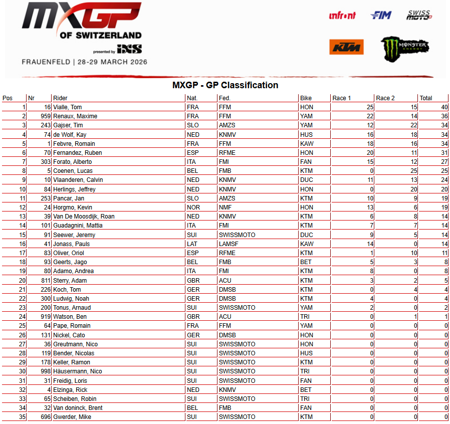 Tom Vialle (1-6) remporte le Grand Prix de Frauenfeld devant Maxime Renaux (2-7) et Tim Gajser (9-2). Kay de Wolf (5-4) termine au pied du podium, devant Romain Febvre (4-5), cinquième. Ruben Fernandez (3-10) se contentera d’une sixième place devant Alberto Forato (6-9), et Lucas Coenen (DQ-1), huitième. Top 10 pour Calvin Vlaanderen (10-8), et Jeffrey Herlings (DNF-3) à Frauenfeld. Romain Pape termine 25ème de sa pige en Grand Prix.