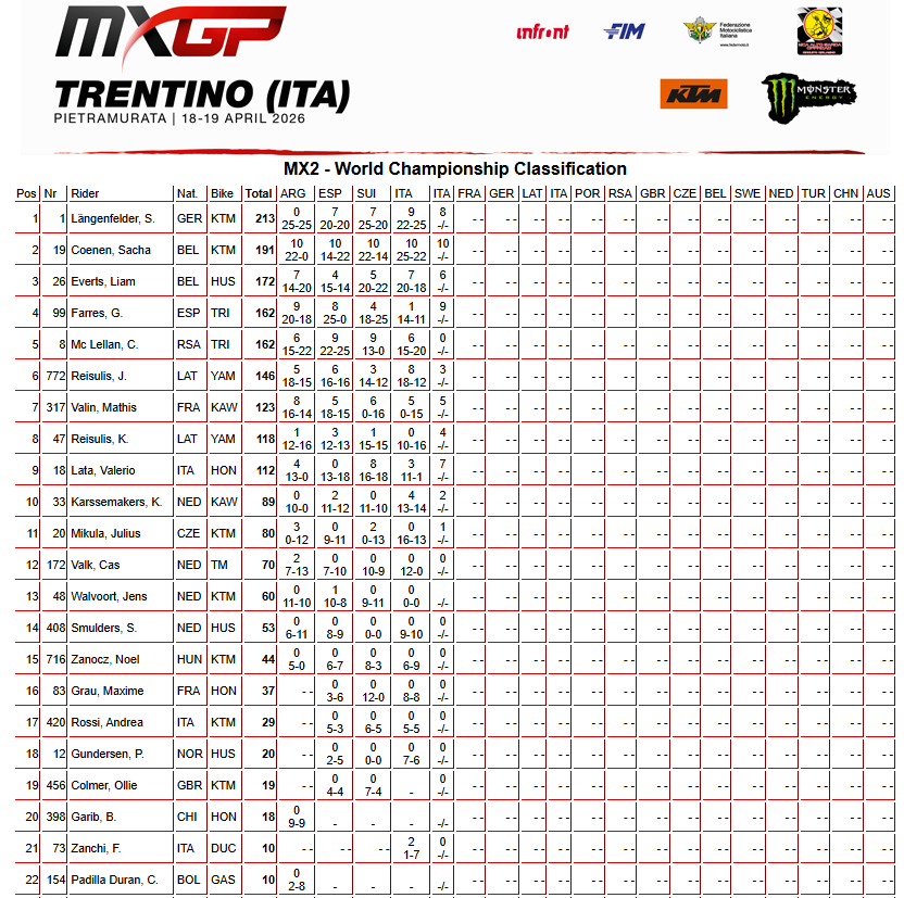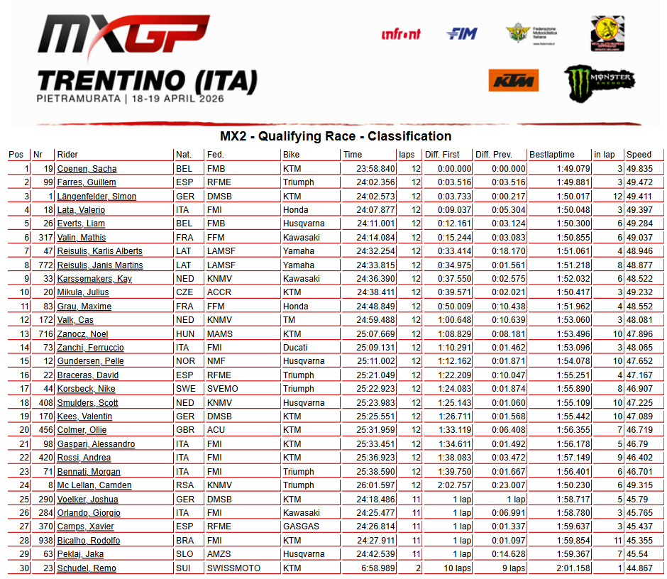 L’Espagnol Guillem Farres s’adjugera la deuxième place, après avoir fait la jonction sur le leader du championnat Simon Langenfelder, troisième de cette manche qualificative MX2 devant Valerio Lata (4e), qui avait un temps doublé l’Allemand avant d’être repris.