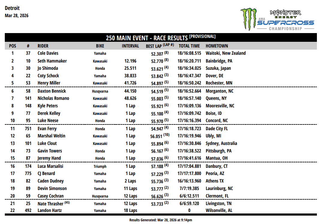 Pour sa première sortie sur la Kawasaki du team PRMX, Kyle Peters termine 8e à Detroit devant Derek Kelley (9e) et Luke Neese (10e).