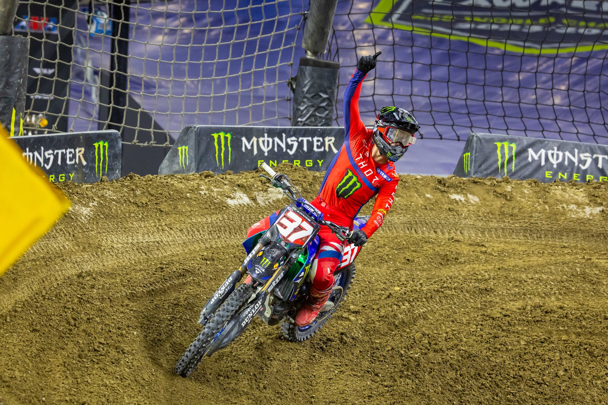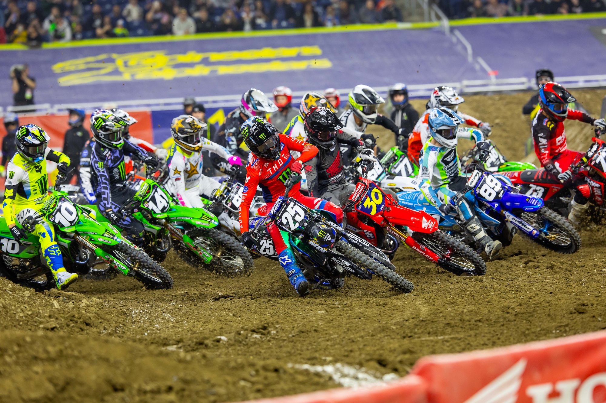 C’est Nate Thrasher qui sortira en tête de la finale 250 de Detroit, mais la soirée du pilote Star Racing Yamaha s’arrêtera rapidement : Nate se prendra un gros volume dans les whoops. Seth Hammaker prendra alors les commandes de la course devant Jo Shimoda et Devin Simonson.