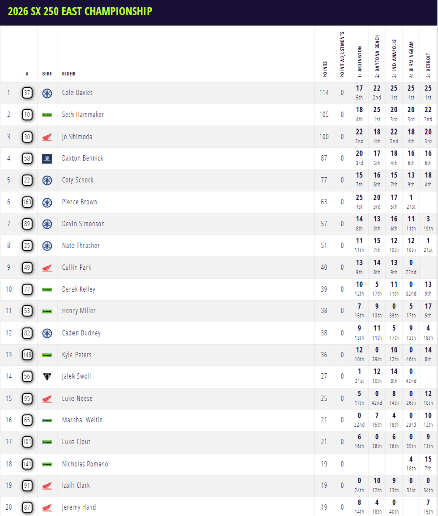 Cole Davies abordera la seconde confrontation est/ouest de l’année avec 9 points d’avance sur Seth Hammaker, et 14 points d’avance sur Jo Shimoda. Le pilote Néo-Zélandais est clairement un ton au-dessus sur la côte Est et va vouloir battre Deegan à la régulière cette fois-ci.