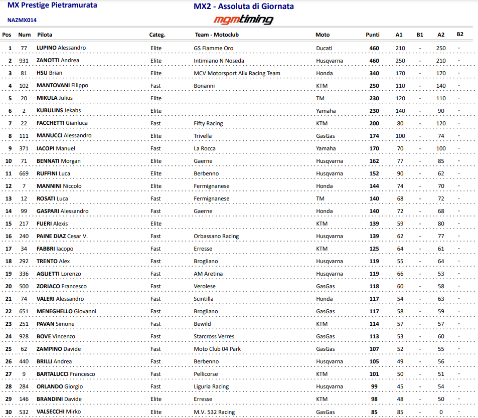 Auteur de la pole aux chronos, le pilote Ducati n’a pas profité de sa place sur la grille au départ de la première manche, ressortant au-delà du top 15 dans les premiers virages. Il a néanmoins signé une belle remontée jusqu’à la deuxième place derrière Andrea Zanotti, vainqueur de sa première manche de la saison. Plus incisif au second départ, Alessandro Lupino a pris les commandes dès le sixième tour pour filer vers sa première victoire de l’année, synonyme également de première consécration pour la 250 Ducati en championnat italien. Sur le podium de la catégorie MX2 à Trentino, Andrea Zanotti et Brian Hsu complètent le top 3 au terme de la journée.