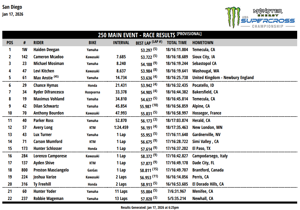 Haiden Deegan ouvre son compteur de victoires pour la saison 2026 à l’occasion du deuxième round et s’empare de la tête du championnat 250 sur la côte Ouest. Après sa quatrième place à Anaheim 1, l’officiel Star Racing Yamaha a redressé la barre à San Diego : meilleur chrono aux essais, victoire en heat mais également en finale. Le voilà désormais leader du championnat, détrônant son coéquipier Max Anstie — qui finira au sol après un échange avec le champion en titre — et récupérant la plaque rouge.