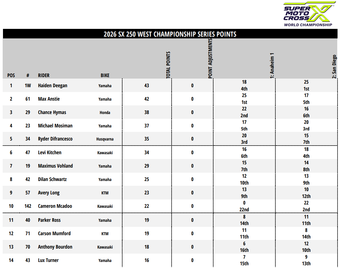Haiden Deegan est désormais leader du championnat pour un point d’avance sur Max Anstie. Chance Hymas pointe troisième avec 5 points de retard sur le haut du classement. En renouant avec le podium, Michael Mosiman (-6) s’empare de la quatrième place provisoire devant Ryder DiFrancesco (-8) et Levi Kitchen (-9), sixième après deux rounds. Suivent Max Vohland, Dilan Schwartz, Avery Long & Cameron McAdoo (-21) dans le top 10 provisoire.