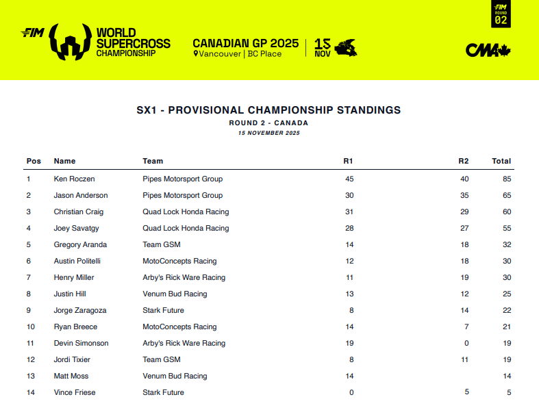 S’il avait dû se contenter d’une 5ᵉ place à Buenos Aires pour le premier round, Jason Anderson monte sur la boîte avec son – nouveau – coéquipier Ken Roczen au Canada ; il s’adjuge la troisième place de la soirée avec un 2-3-4 qui lui permet de se replacer au championnat.