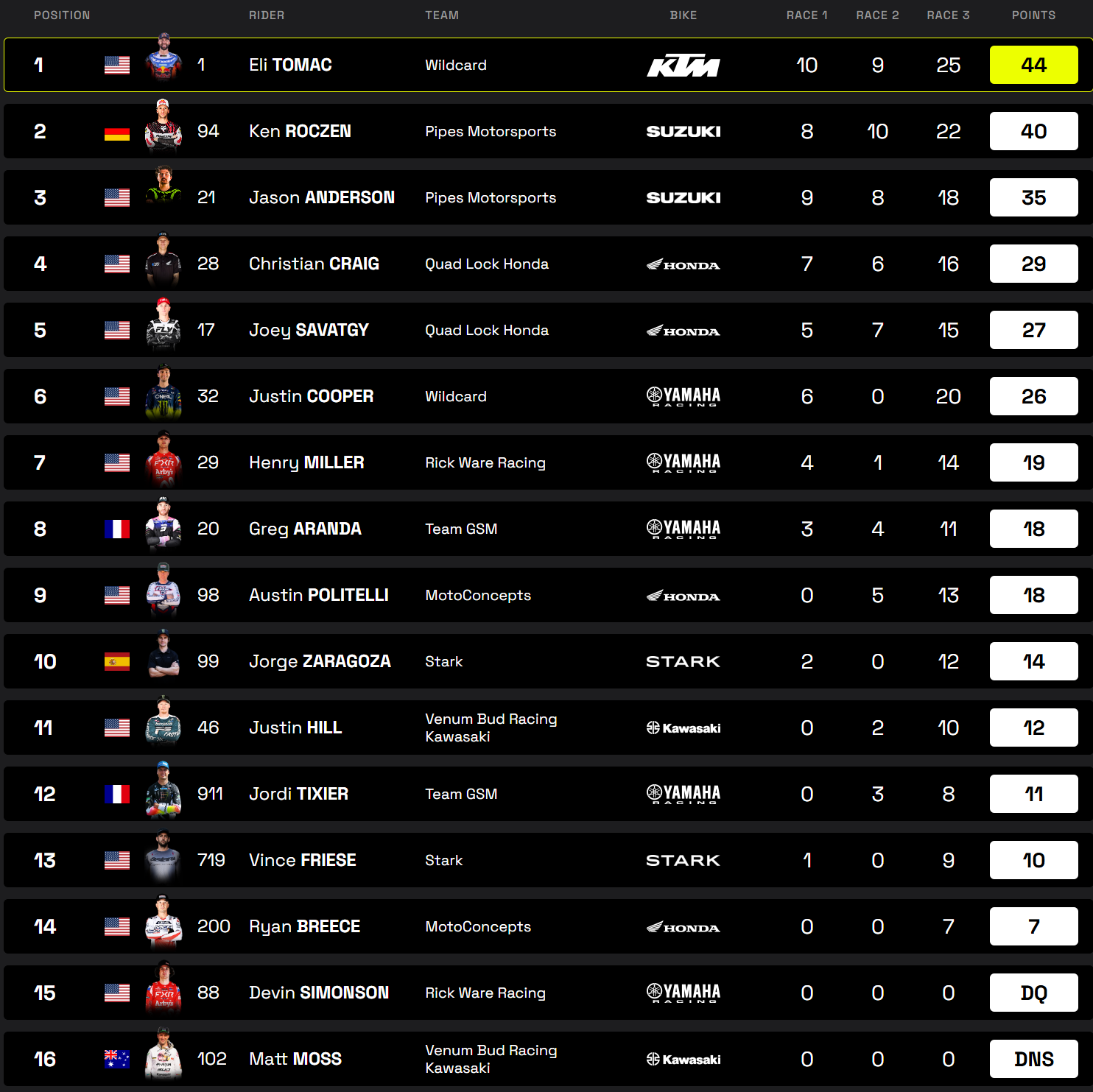 Justin Cooper (6–DNF–3) avait un bon coup à jouer, mais l’officiel Star Racing Yamaha sera contraint à l’abandon en toute fin de seconde finale, alors qu’il avait mené le début de course face à Eli Tomac. Pour sa seconde – et dernière – apparition sur le WSX cette saison, il se contentera de la sixième place, devant Henry Miller (7-10-7) et Grégory Aranda (8-7-10), qui ramène le meilleur résultat français pour GSM Yamaha, Jordi Tixier finissant 12ᵉ.