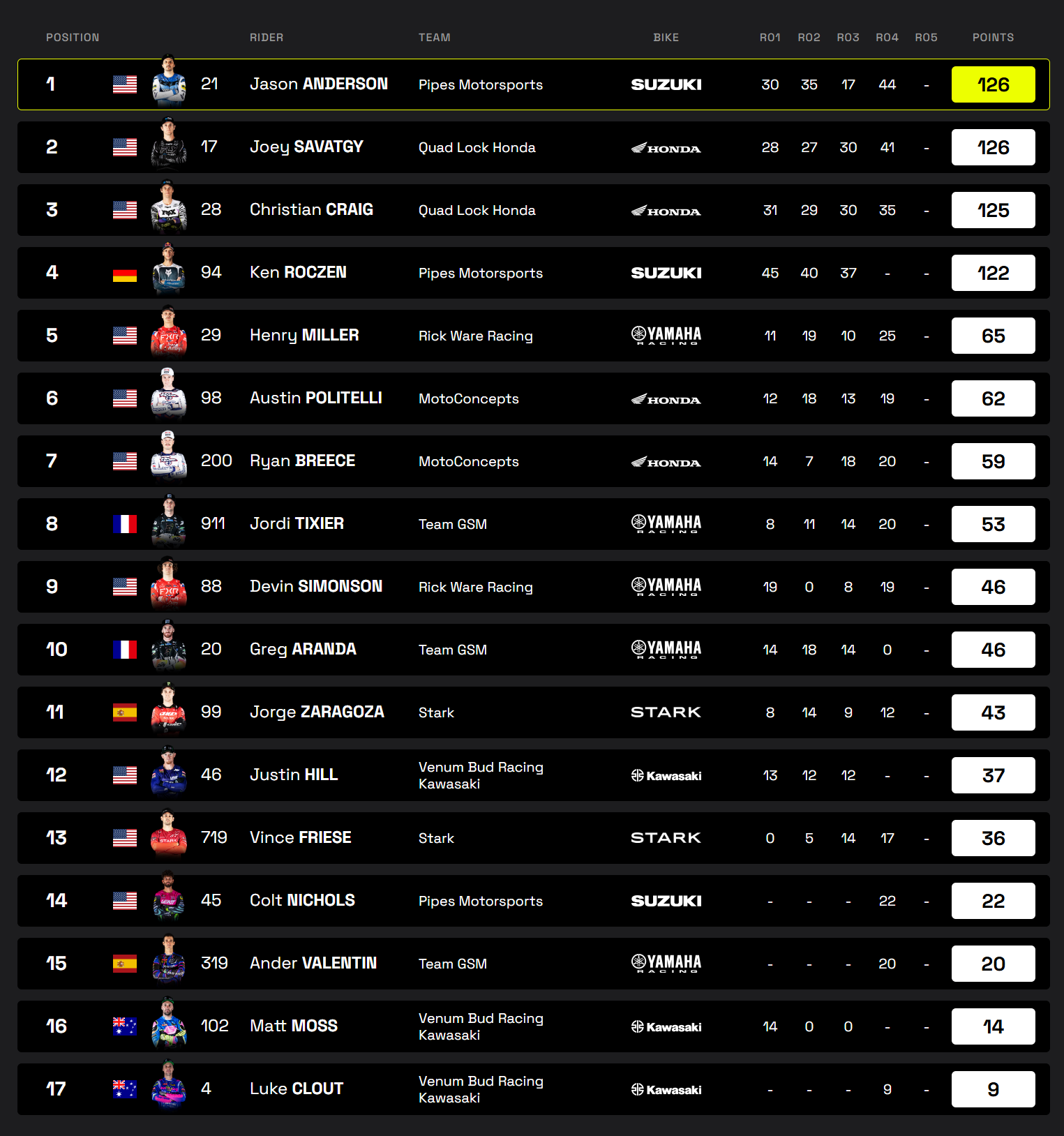 La quatrième place revient à Henry Miller (4-DNF-4). Le pilote RWR signe là son meilleur résultat de la saison et devance Colt Nichols (5-3-DNF), qui prend la relève de Ken Roczen pour la fin de saison.