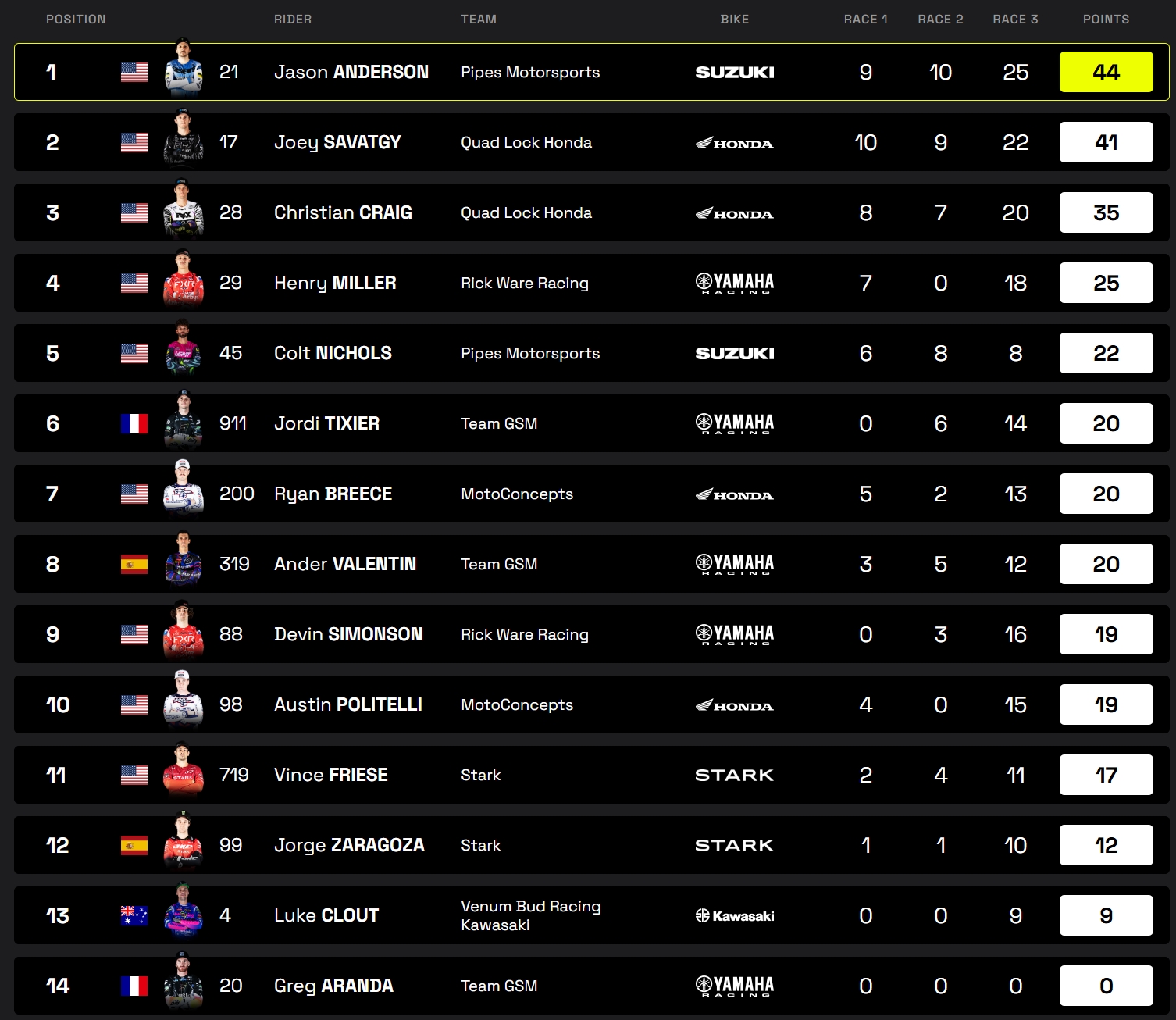 Jason Anderson quitte la suède avec 126 points à son compteur – ex aequo avec Joey Savatgy – et portera la plaque rouge en Afrique du sud pour la finale. Christian Craig ne compte qu’une unité de retard à ce stade des opérations, alors que Ken Roczen est toujours installé en quatrième place et devrait parvenir à conserver cette dernière malgré ses absences sur la fin de saison. Suite au retrait de Grégory Aranday, Henry Miller (-61) s’est emparé de la cinquième place provisoire au championnat SX1, devant Austin Politelli (-64), Ryan Breece (-67), et Jordi Tixier (-73).