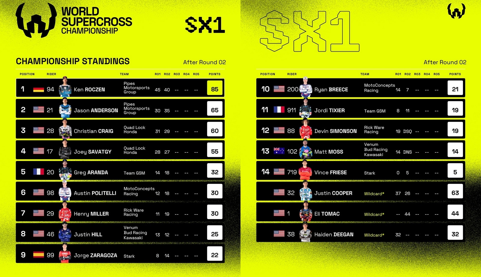 Vainqueur à Buenos Aires et deuxième derrière Eli Tomac à Vancouver, Ken Roczen conserve la plaque rouge après les deux premiers rounds, avec 20 points d’avance sur son nouveau coéquipier Jason Anderson, qui a signé une cinquième place en Argentine et une troisième place au Canada. Dans les faits, Anderson pourrait être le mieux placé pour récupérer la plaque rouge dès le GP de Suède, sachant que jusqu’à 45 points sont à attribuer par épreuve en cas de triplé (Sprint 1 + Sprint 2 + Finale).