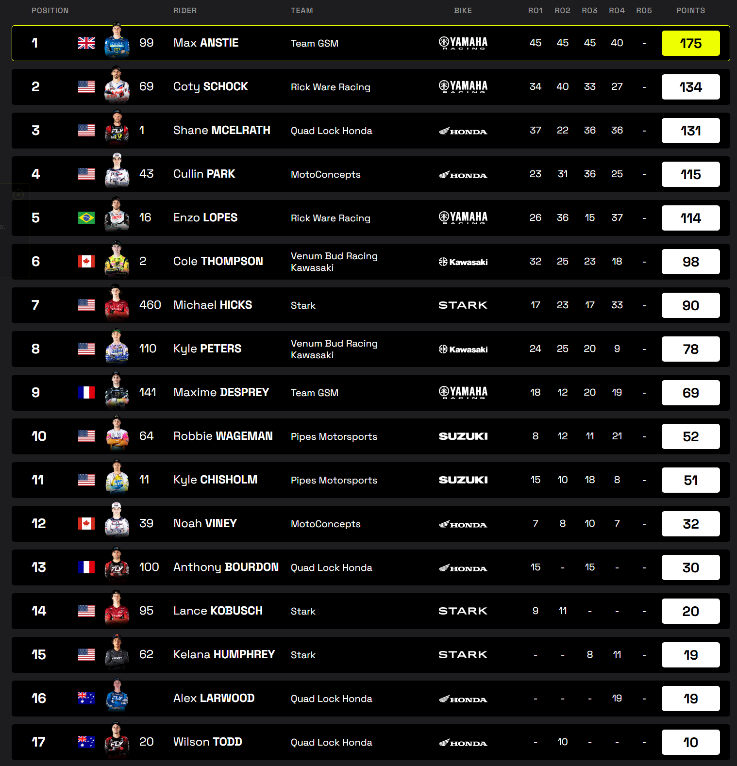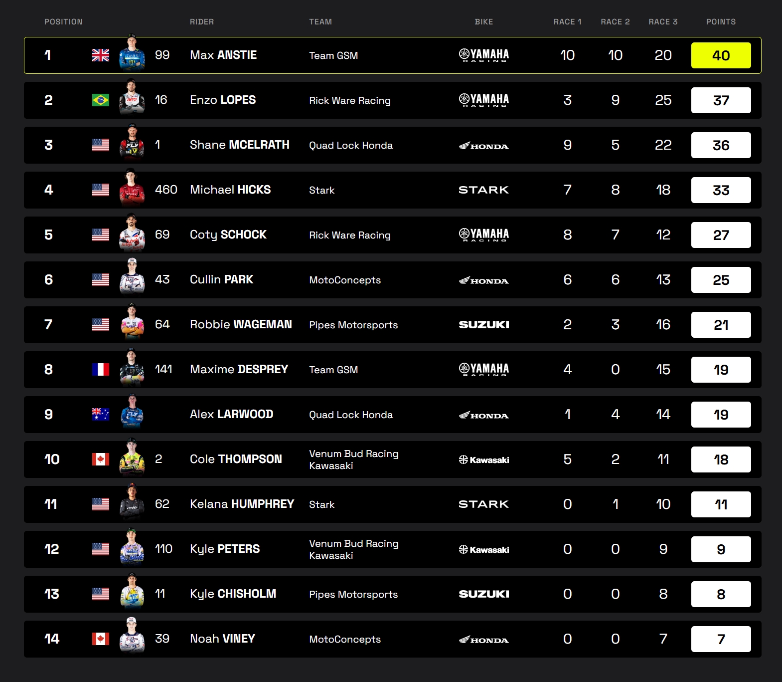 Max Anstie abordera la finale en Afrique du Sud avec 41 points d’avance sur Coty Schock, et 44 points d’avance sur Shane McElrath. Un boulevard sachant que 45 points – maximum – sont à prendre à chaque round. Dans les faits, un top 7 lors du premier sprint à Cape Town le week-end prochain lui assurera la couronne. Cullin Park (-60) repart de Suède avec la quatrième place provisoire devant le Brésilien Enzo Lopes (-61). Sixième, Cole Thompson devance Michael Hicks, Kyle Peters et Maxime Desprey (-106).