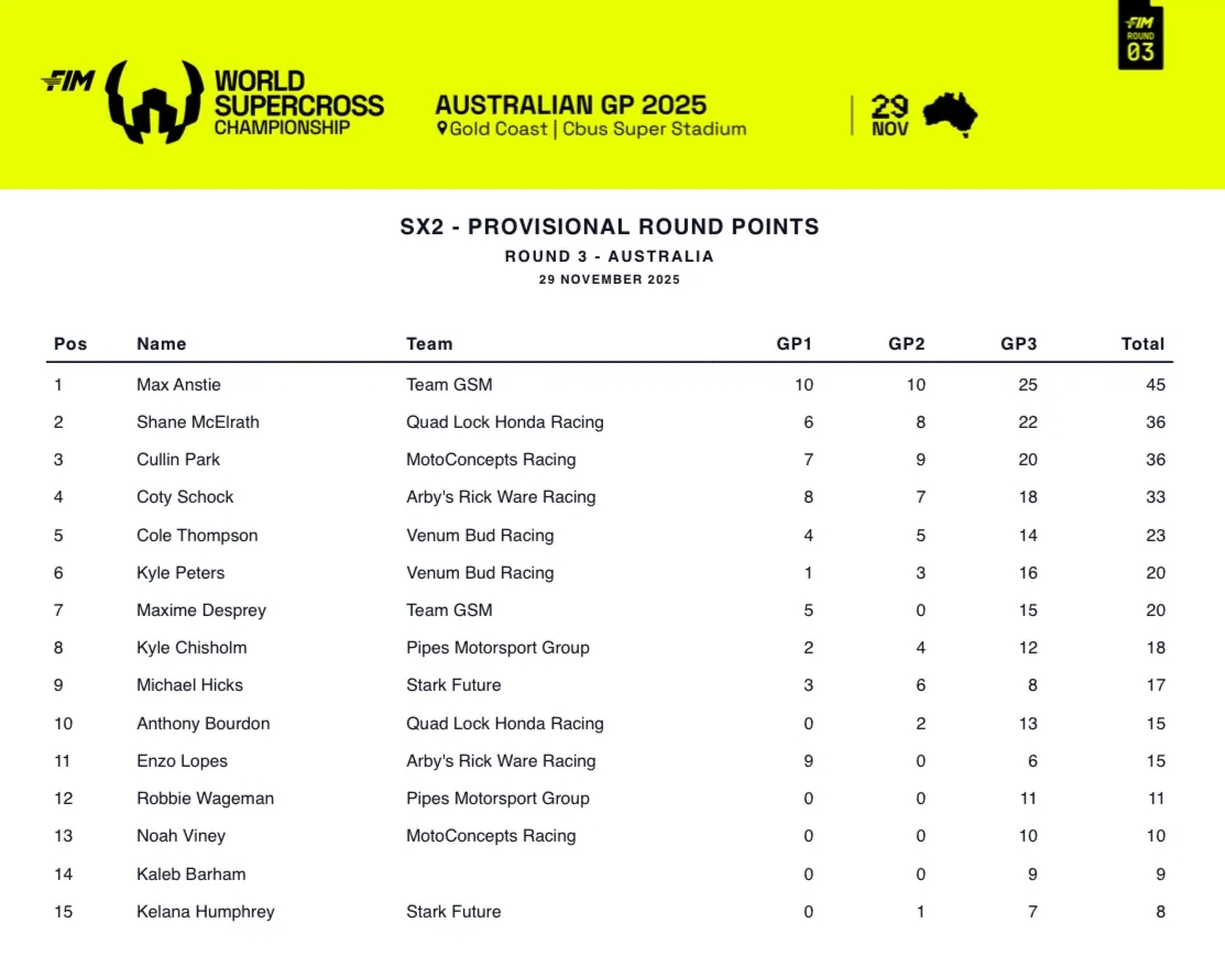 Max Anstie quitte l’Australie avec 28 points d’avance sur Coty Schock – désormais second du championnat SX2 – et 40 points d’avance sur Shane McElrath. Culling Park (-45) et Cole Thompson (-55) gagnent aussi un rang en prenant le meilleur sur Enzo Lopes (-58) qui ne ramène que 15 petits points de ce troisième round. Le pilote Brésilien rétrograde à la sixième place provisoire du championnat. Suivent Kyle Peters, Michael Hicks, Maxime Desprey et Kyle Chisholm dans le top 10 avant la Suède, le week-end prochain.