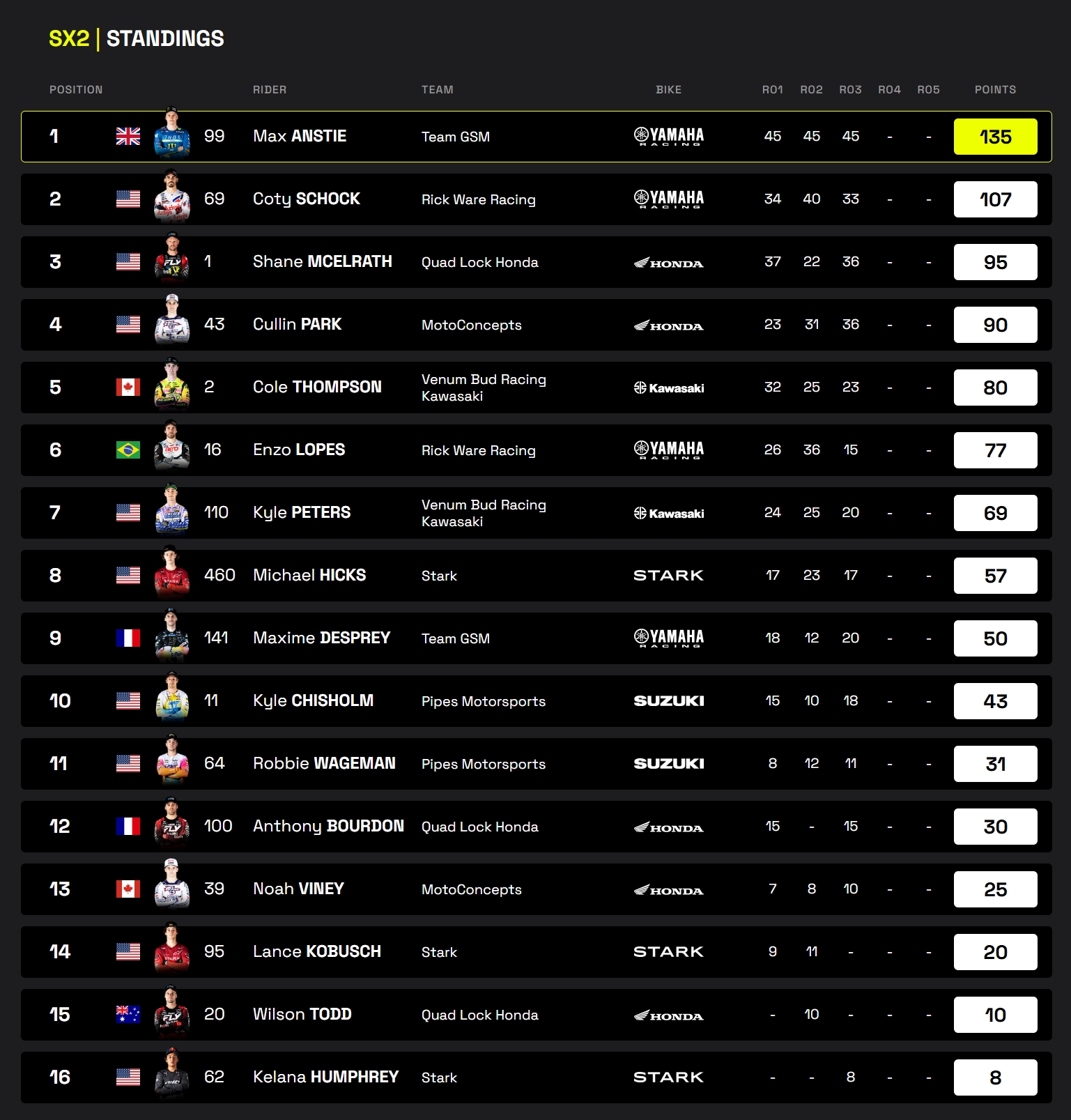 Seul accroc de son week-end : une erreur lors de la Superpole. Pour le reste, Anstie a livré une nouvelle copie parfaite devant un stade bien rempli pour ce troisième rendez-vous de la saison. Après s’être débarrassé d’Enzo Lopes en première manche, il signera le holeshot et mènera chaque tour de la seconde. En finale, il prendra également le dessus à l’issue d’un bref duel avec Shane McElrath. Résultat : 45 points supplémentaires à son compteur avant l’étape suédoise.